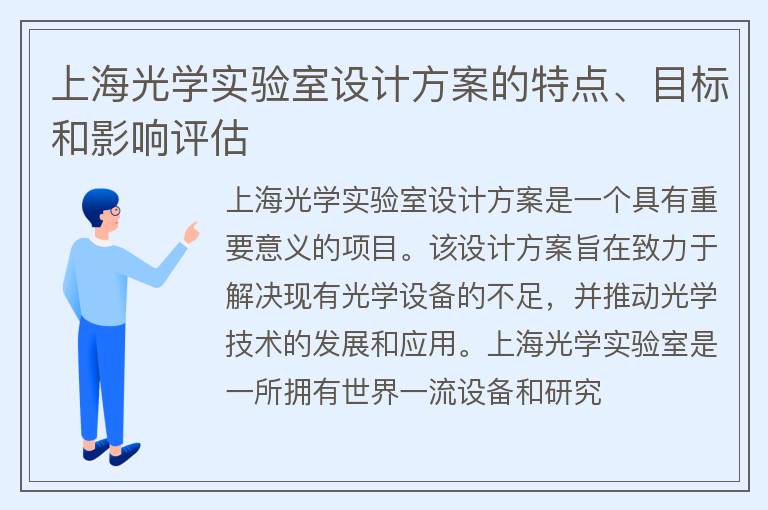 上海光学实验室设计方案是一个具有重要意义的项目。该设计方案旨在致力于解决现有光学设备的不足,并推动光学技术的发展和应用。上海光学实验室是一所拥有世界一流设备和研究......【点击详情】