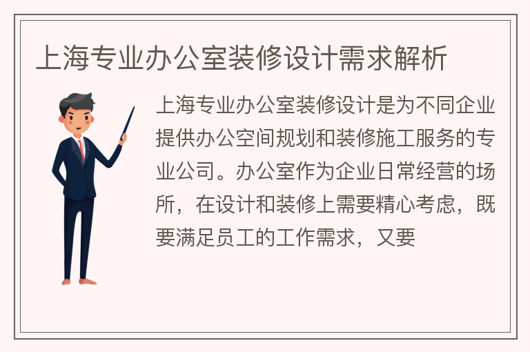 上海专业办公室装修设计是为不同企业提供办公空间规划和装修施工服务的专业公司。办公室作为企业日常经营的场所,在设计和装修上需要精心考虑,既要满足员工的工作需求,又要......【点击详情】