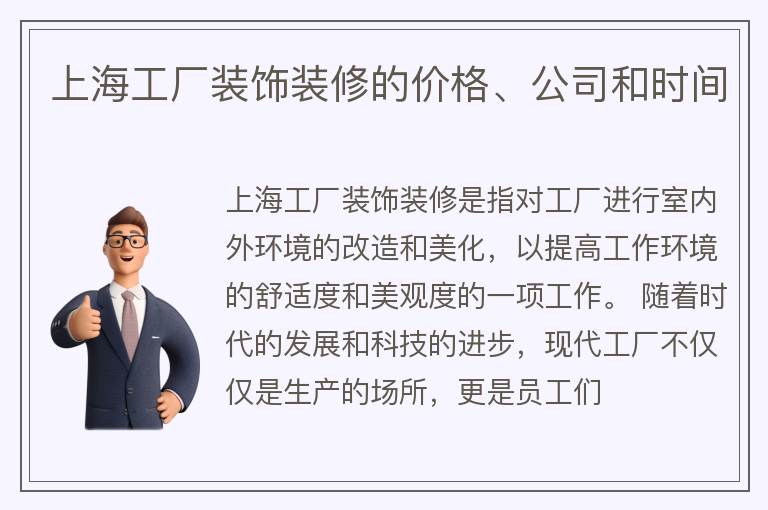 上海工厂装饰装修是指对工厂进行室内外环境的改造和美化,以提高工作环境的舒适度和美观度的一项工作。 随着时代的发展和科技的进步,现代工厂不仅仅是生产的场所,更是员工们......【点击详情】
