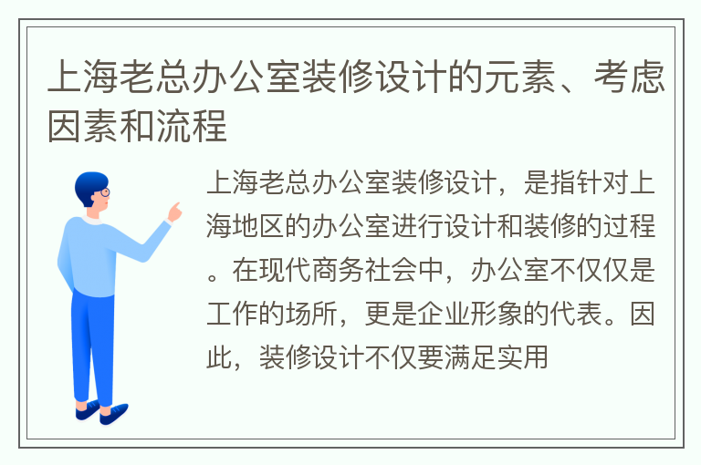 上海老总办公室装修设计,是指针对上海地区的办公室进行设计和装修的过程。在现代商务社会中,办公室不仅仅是工作的场所,更是企业形象的代表。因此,装修设计不仅要满足实用......【点击详情】