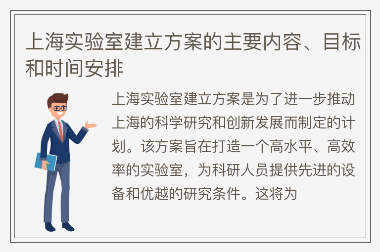 上海实验室建立方案是为了进一步推动上海的科学研究和创新发展而制定的计划。该方案旨在打造一个高水平、高效率的实验室,为科研人员提供先进的设备和优越的研究条件。这将为......【点击详情】