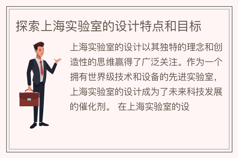上海实验室的设计以其独特的理念和创造性的思维赢得了广泛关注。作为一个拥有世界级技术和设备的先进实验室,上海实验室的设计成为了未来科技发展的催化剂。 在上海实验室的设......【点击详情】