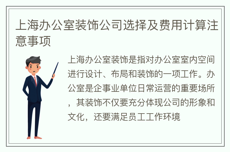 上海办公室装饰是指对办公室室内空间进行设计、布局和装饰的一项工作。办公室是企事业单位日常运营的重要场所,其装饰不仅要充分体现公司的形象和文化,还要满足员工工作环境......【点击详情】