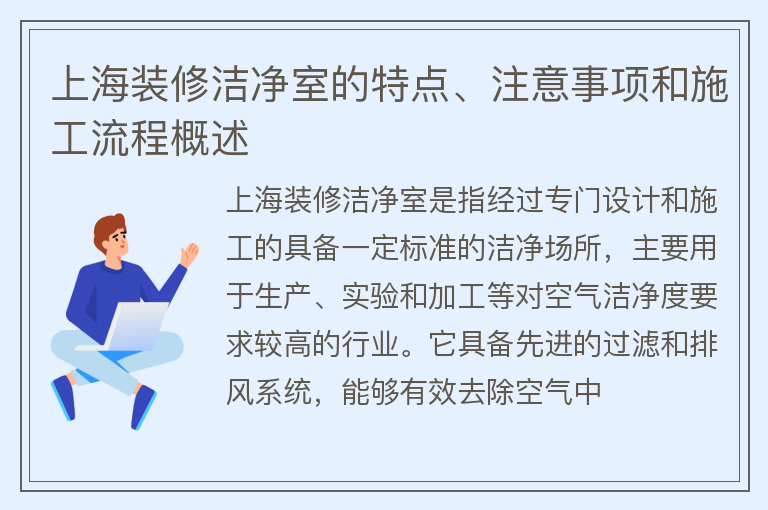 上海装修洁净室是指经过专门设计和施工的具备一定标准的洁净场所,主要用于生产、实验和加工等对空气洁净度要求较高的行业。它具备先进的过滤和排风系统,能够有效去除空气中......【点击详情】