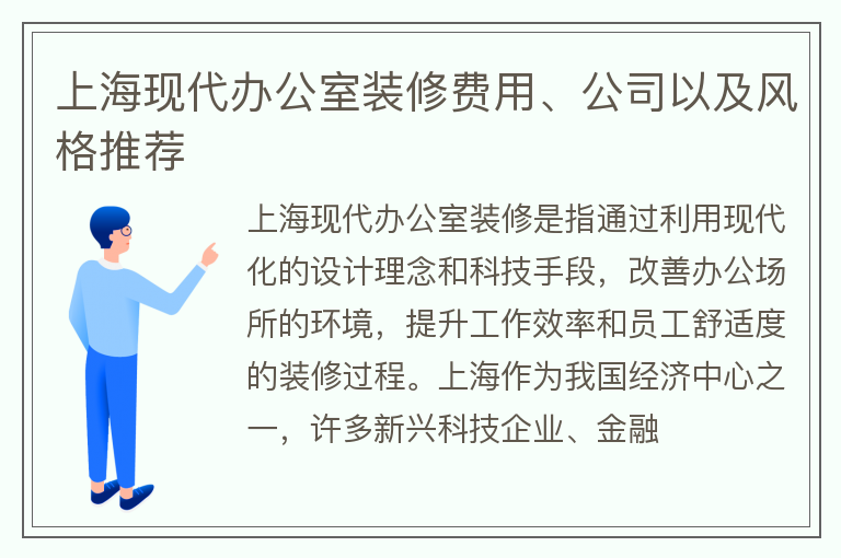 上海现代办公室装修是指通过利用现代化的设计理念和科技手段,改善办公场所的环境,提升工作效率和员工舒适度的装修过程。上海作为我国经济中心之一,许多新兴科技企业、金融......【点击详情】