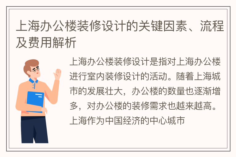 上海办公楼装修设计是指对上海办公楼进行室内装修设计的活动。随着上海城市的发展壮大,办公楼的数量也逐渐增多,对办公楼的装修需求也越来越高。上海作为中国经济的中心城市......【点击详情】