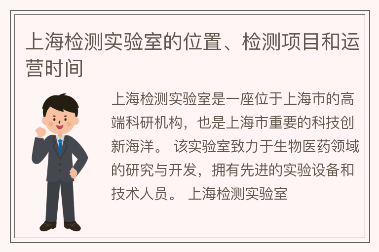 上海检测实验室是一座位于上海市的高端科研机构,也是上海市重要的科技创新海洋。 该实验室致力于生物医药领域的研究与开发,拥有先进的实验设备和技术人员。 上海检测实验室......【点击详情】