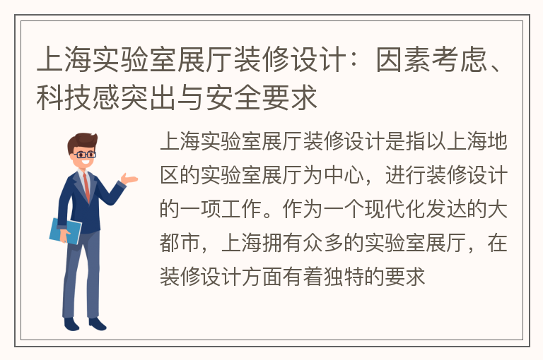 上海实验室展厅装修设计是指以上海地区的实验室展厅为中心,进行装修设计的一项工作。作为一个现代化发达的大都市,上海拥有众多的实验室展厅,在装修设计方面有着独特的要求......【点击详情】