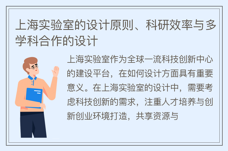 上海实验室作为全球一流科技创新中心的建设平台,在如何设计方面具有重要意义。在上海实验室的设计中,需要考虑科技创新的需求,注重人才培养与创新创业环境打造,共享资源与......【点击详情】