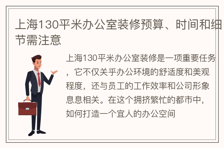 上海130平米办公室装修是一项重要任务,它不仅关乎办公环境的舒适度和美观程度,还与员工的工作效率和公司形象息息相关。在这个拥挤繁忙的都市中,如何打造一个宜人的办公空间......【点击详情】