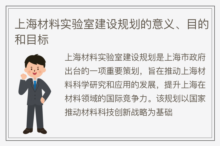 上海材料实验室建设规划是上海市政府出台的一项重要策划,旨在推动上海材料科学研究和应用的发展,提升上海在材料领域的国际竞争力。该规划以国家推动材料科技创新战略为基础......【点击详情】