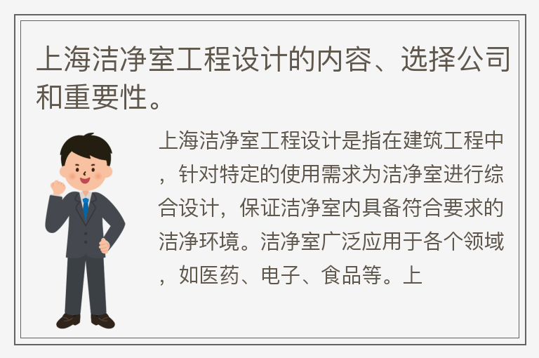 上海洁净室工程设计是指在建筑工程中,针对特定的使用需求为洁净室进行综合设计,保证洁净室内具备符合要求的洁净环境。洁净室广泛应用于各个领域,如医药、电子、食品等。上......【点击详情】