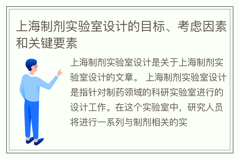 上海制剂实验室设计的目标、考虑因素和关键要素