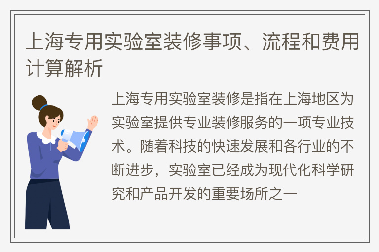 上海专用实验室装修是指在上海地区为实验室提供专业装修服务的一项专业技术。随着科技的快速发展和各行业的不断进步,实验室已经成为现代化科学研究和产品开发的重要场所之一......【点击详情】