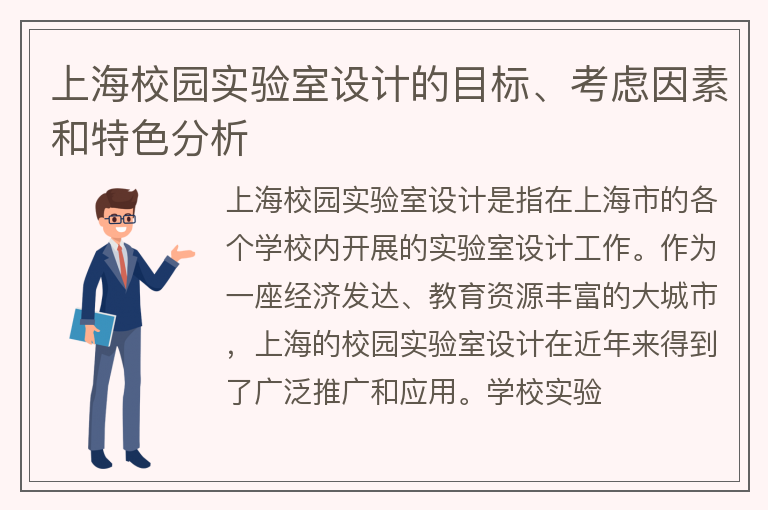 上海校园实验室设计是指在上海市的各个学校内开展的实验室设计工作。作为一座经济发达、教育资源丰富的大城市,上海的校园实验室设计在近年来得到了广泛推广和应用。学校实验......【点击详情】