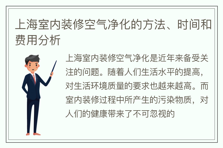 上海室内装修空气净化是近年来备受关注的问题。随着人们生活水平的提高,对生活环境质量的要求也越来越高。而室内装修过程中所产生的污染物质,对人们的健康带来了不可忽视的......【点击详情】