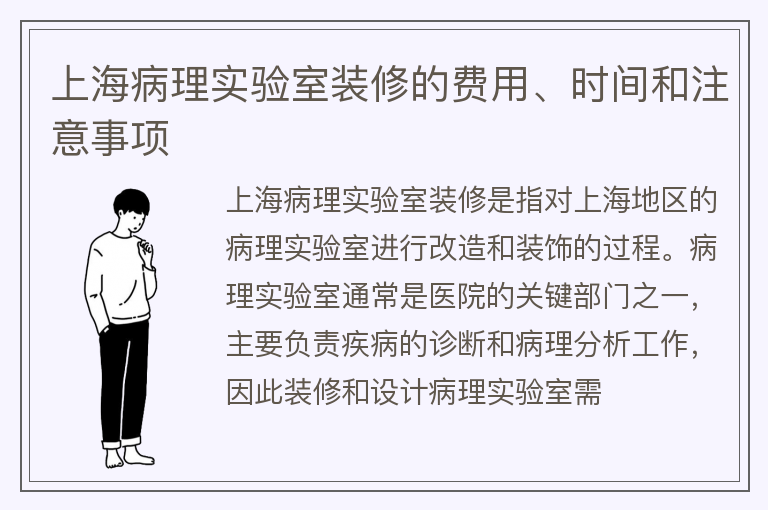 上海病理实验室装修是指对上海地区的病理实验室进行改造和装饰的过程。病理实验室通常是医院的关键部门之一,主要负责疾病的诊断和病理分析工作,因此装修和设计病理实验室需......【点击详情】