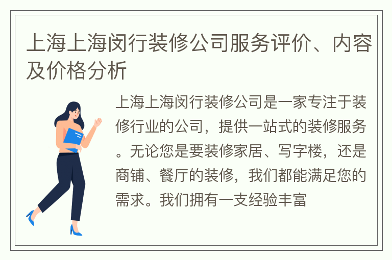 上海上海闵行装修公司是一家专注于装修行业的公司,提供一站式的装修服务。无论您是要装修家居、写字楼,还是商铺、餐厅的装修,我们都能满足您的需求。我们拥有一支经验丰富......【点击详情】