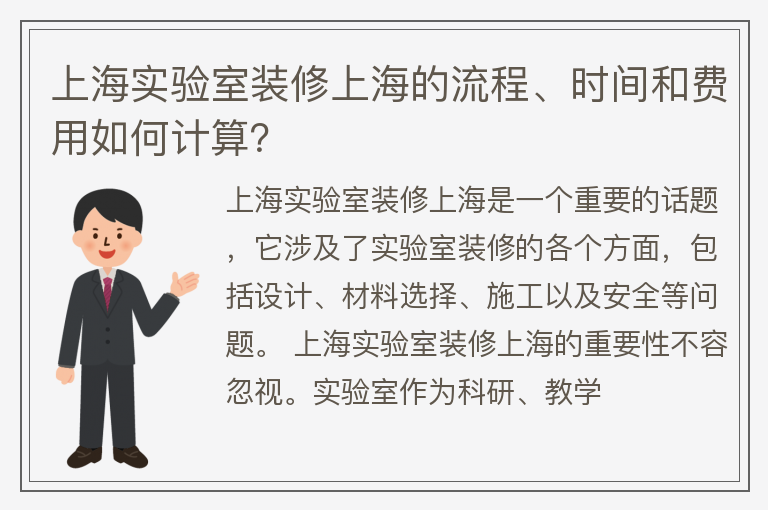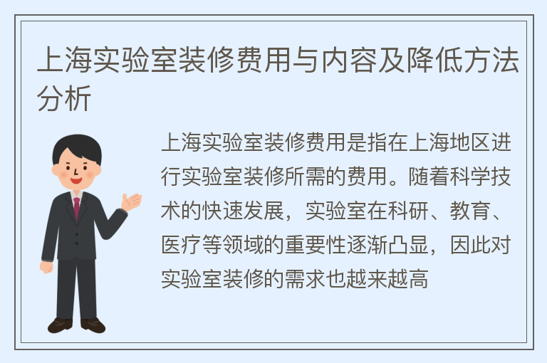 上海实验室装修费用是指在上海地区进行实验室装修所需的费用。随着科学技术的快速发展,实验室在科研、教育、医疗等领域的重要性逐渐凸显,因此对实验室装修的需求也越来越高......【点击详情】