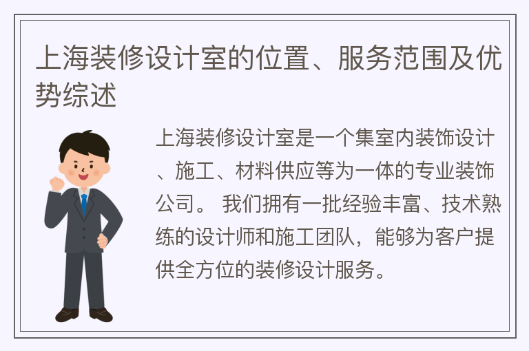 上海装修设计室是一个集室内装饰设计、施工、材料供应等为一体的专业装饰公司。 我们拥有一批经验丰富、技术熟练的设计师和施工团队,能够为客户提供全方位的装修设计服务。......【点击详情】