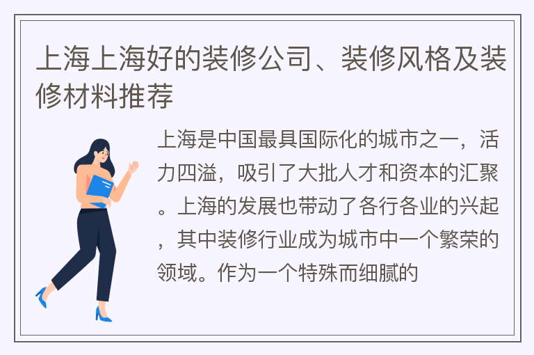 上海是中国最具国际化的城市之一,活力四溢,吸引了大批人才和资本的汇聚。上海的发展也带动了各行各业的兴起,其中装修行业成为城市中一个繁荣的领域。作为一个特殊而细腻的......【点击详情】