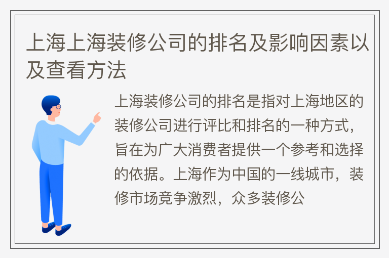 上海装修公司的排名是指对上海地区的装修公司进行评比和排名的一种方式,旨在为广大消费者提供一个参考和选择的依据。上海作为中国的一线城市,装修市场竞争激烈,众多装修公......【点击详情】