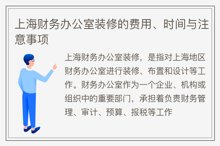 上海财务办公室装修,是指对上海地区财务办公室进行装修、布置和设计等工作。财务办公室作为一个企业、机构或组织中的重要部门,承担着负责财务管理、审计、预算、报税等工作......【点击详情】