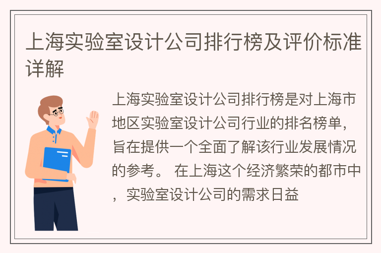 上海实验室设计公司排行榜是对上海市地区实验室设计公司行业的排名榜单,旨在提供一个全面了解该行业发展情况的参考。 在上海这个经济繁荣的都市中,实验室设计公司的需求日益......【点击详情】