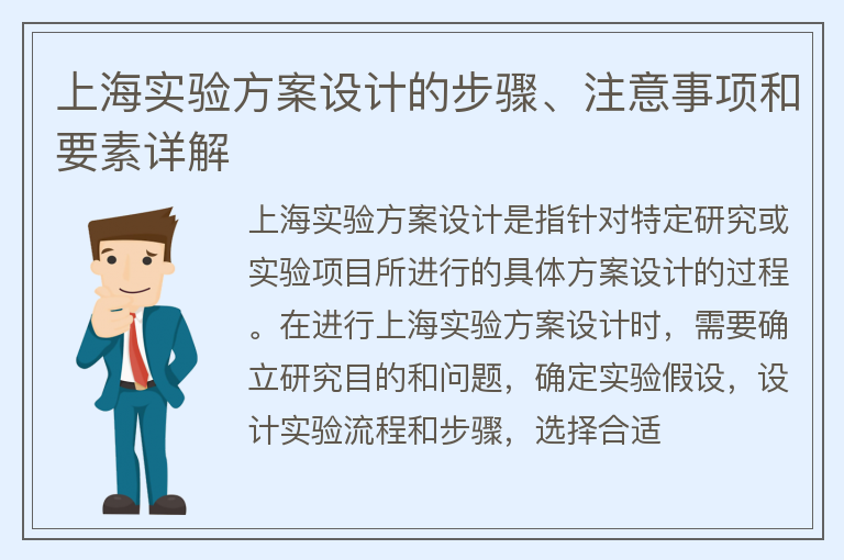 上海实验方案设计是指针对特定研究或实验项目所进行的具体方案设计的过程。在进行上海实验方案设计时,需要确立研究目的和问题,确定实验假设,设计实验流程和步骤,选择合适......【点击详情】