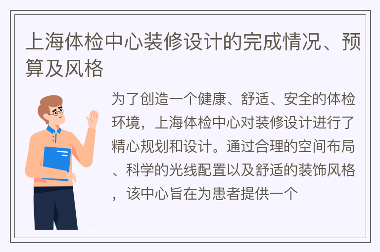 为了创造一个健康、舒适、安全的体检环境,上海体检中心对装修设计进行了精心规划和设计。通过合理的空间布局、科学的光线配置以及舒适的装饰风格,该中心旨在为患者提供一个......【点击详情】