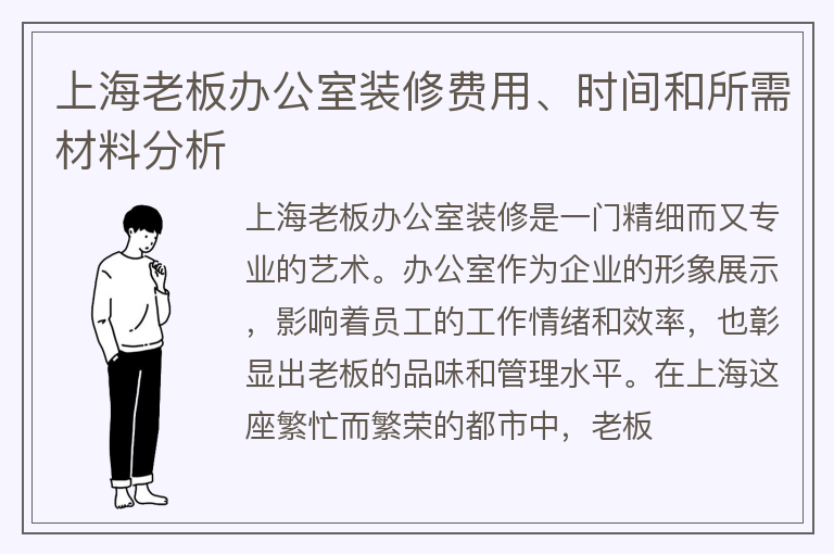 上海老板办公室装修是一门精细而又专业的艺术。办公室作为企业的形象展示,影响着员工的工作情绪和效率,也彰显出老板的品味和管理水平。在上海这座繁忙而繁荣的都市中,老板......【点击详情】