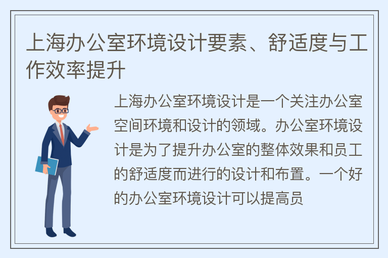 上海办公室环境设计是一个关注办公室空间环境和设计的领域。办公室环境设计是为了提升办公室的整体效果和员工的舒适度而进行的设计和布置。一个好的办公室环境设计可以提高员......【点击详情】