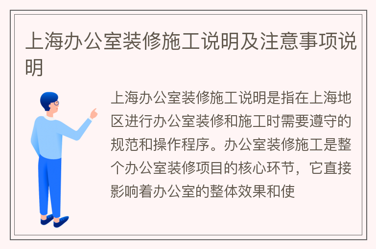 上海办公室装修施工说明是指在上海地区进行办公室装修和施工时需要遵守的规范和操作程序。办公室装修施工是整个办公室装修项目的核心环节,它直接影响着办公室的整体效果和使......【点击详情】