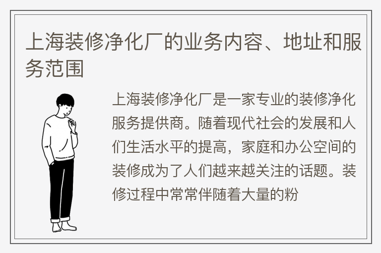 上海装修净化厂是一家专业的装修净化服务提供商。随着现代社会的发展和人们生活水平的提高,家庭和办公空间的装修成为了人们越来越关注的话题。装修过程中常常伴随着大量的粉......【点击详情】