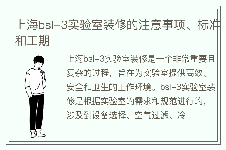 上海bsl-3实验室装修是一个非常重要且复杂的过程,旨在为实验室提供高效、安全和卫生的工作环境。bsl-3实验室装修是根据实验室的需求和规范进行的,涉及到设备选择、空气过滤、冷......【点击详情】