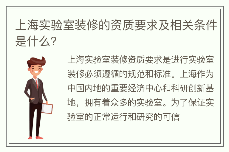 上海实验室装修资质要求是进行实验室装修必须遵循的规范和标准。上海作为中国内地的重要经济中心和科研创新基地,拥有着众多的实验室。为了保证实验室的正常运行和研究的可信......【点击详情】