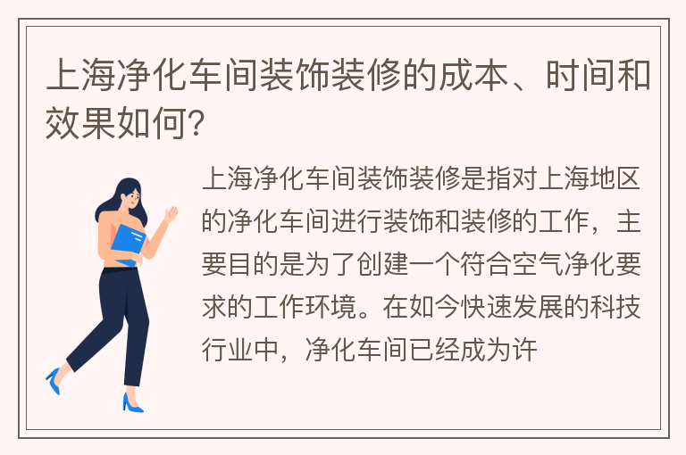 上海净化车间装饰装修是指对上海地区的净化车间进行装饰和装修的工作,主要目的是为了创建一个符合空气净化要求的工作环境。在如今快速发展的科技行业中,净化车间已经成为许......【点击详情】