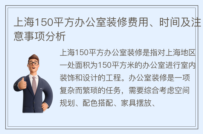 上海150平方办公室装修是指对上海地区一处面积为150平方米的办公室进行室内装饰和设计的工程。办公室装修是一项复杂而繁琐的任务,需要综合考虑空间规划、配色搭配、家具摆放、......【点击详情】