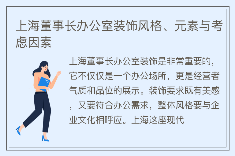 上海董事长办公室装饰是非常重要的,它不仅仅是一个办公场所,更是经营者气质和品位的展示。装饰要求既有美感,又要符合办公需求,整体风格要与企业文化相呼应。上海这座现代......【点击详情】