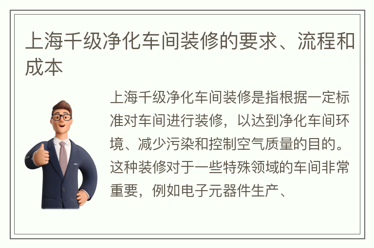 上海千级净化车间装修是指根据一定标准对车间进行装修,以达到净化车间环境、减少污染和控制空气质量的目的。这种装修对于一些特殊领域的车间非常重要,例如电子元器件生产、......【点击详情】