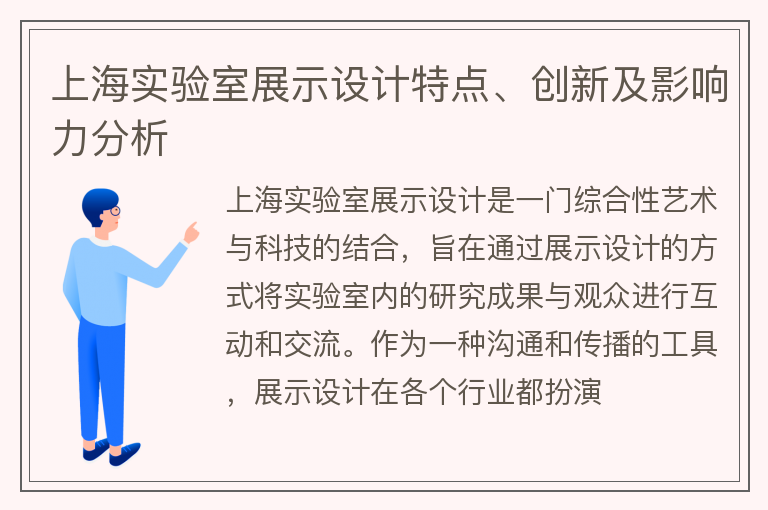 上海实验室展示设计是一门综合性艺术与科技的结合,旨在通过展示设计的方式将实验室内的研究成果与观众进行互动和交流。作为一种沟通和传播的工具,展示设计在各个行业都扮演......【点击详情】