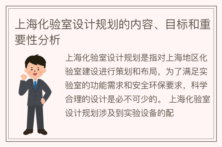 上海化验室设计规划是指对上海地区化验室建设进行策划和布局,为了满足实验室的功能需求和安全环保要求,科学合理的设计是必不可少的。 上海化验室设计规划涉及到实验设备的配......【点击详情】