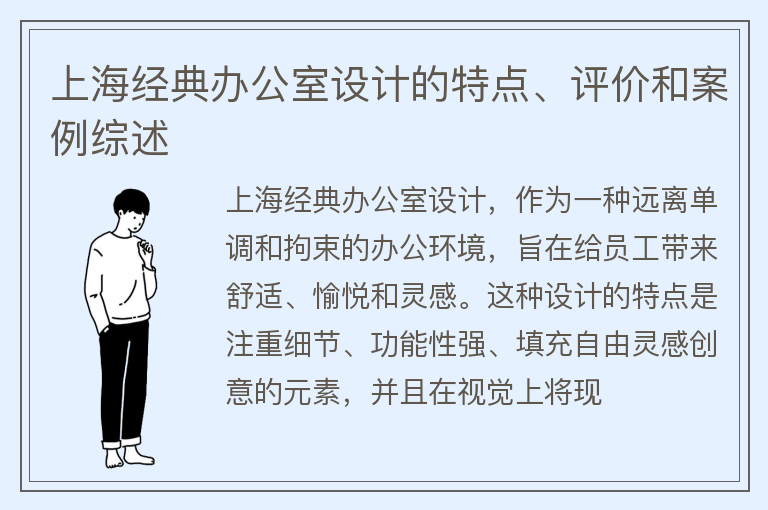 上海经典办公室设计,作为一种远离单调和拘束的办公环境,旨在给员工带来舒适、愉悦和灵感。这种设计的特点是注重细节、功能性强、填充自由灵感创意的元素,并且在视觉上将现......【点击详情】