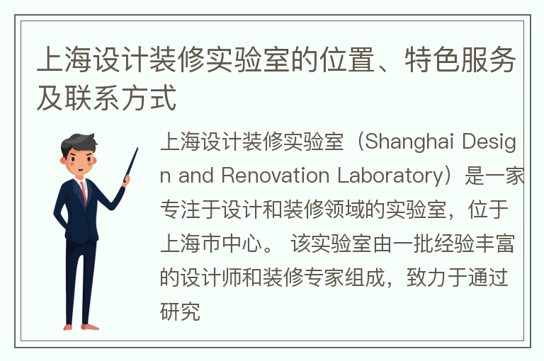 上海设计装修实验室(Shanghai Design and Renovation Laboratory)是一家专注于设计和装修领域的实验室,位于上海市中心。 该实验室由一批经验丰富的设计师和装修专家组成,致力于通过研究......【点击详情】