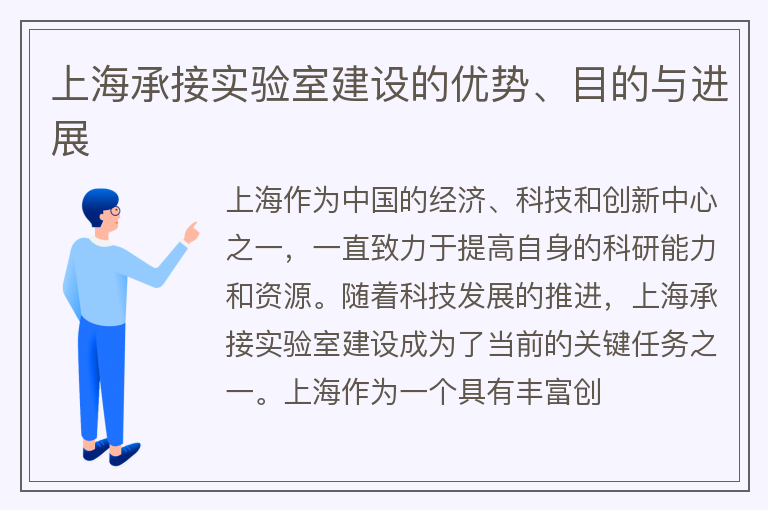 上海作为中国的经济、科技和创新中心之一,一直致力于提高自身的科研能力和资源。随着科技发展的推进,上海承接实验室建设成为了当前的关键任务之一。上海作为一个具有丰富创......【点击详情】