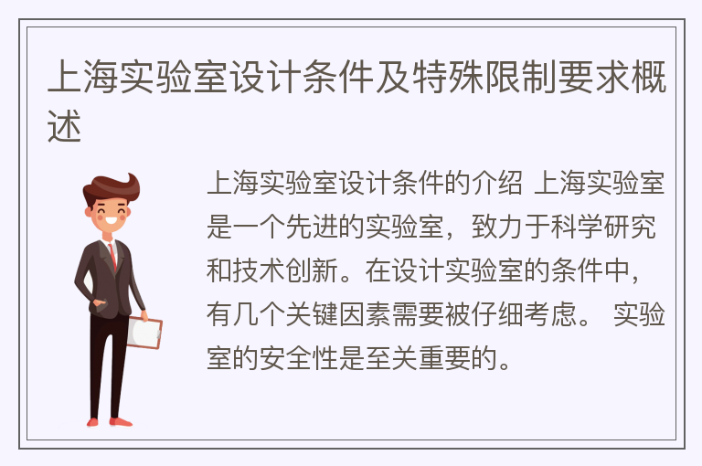 上海实验室设计条件的介绍 上海实验室是一个先进的实验室,致力于科学研究和技术创新。在设计实验室的条件中,有几个关键因素需要被仔细考虑。 实验室的安全性是至关重要的。......【点击详情】