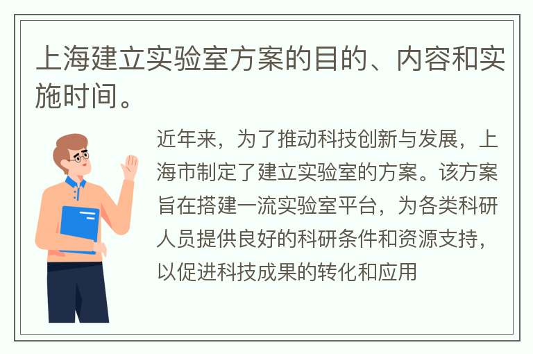近年来,为了推动科技创新与发展,上海市制定了建立实验室的方案。该方案旨在搭建一流实验室平台,为各类科研人员提供良好的科研条件和资源支持,以促进科技成果的转化和应用......【点击详情】