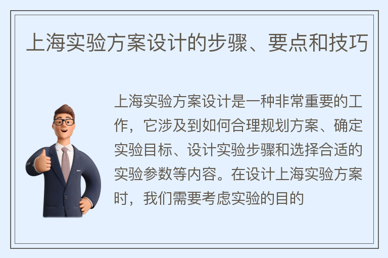 上海实验方案设计是一种非常重要的工作,它涉及到如何合理规划方案、确定实验目标、设计实验步骤和选择合适的实验参数等内容。在设计上海实验方案时,我们需要考虑实验的目的......【点击详情】