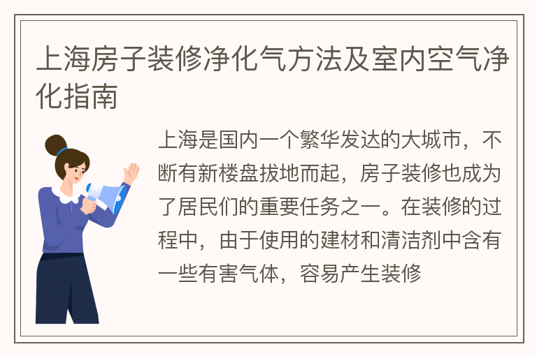 上海是国内一个繁华发达的大城市,不断有新楼盘拔地而起,房子装修也成为了居民们的重要任务之一。在装修的过程中,由于使用的建材和清洁剂中含有一些有害气体,容易产生装修......【点击详情】