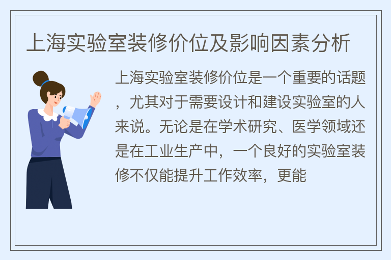 上海实验室装修价位是一个重要的话题,尤其对于需要设计和建设实验室的人来说。无论是在学术研究、医学领域还是在工业生产中,一个良好的实验室装修不仅能提升工作效率,更能......【点击详情】